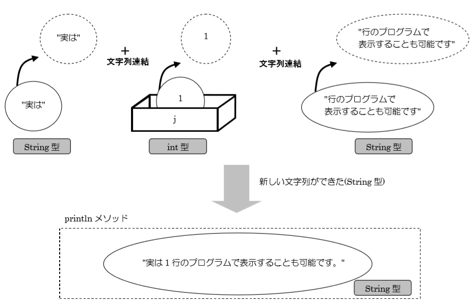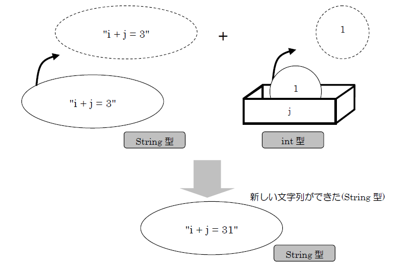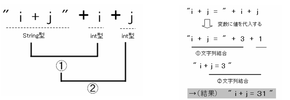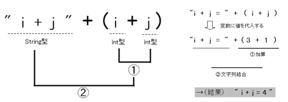 次に②の演算部分を説明します。ここでは①の演算の結果をもとに「”i + j =” + 4」という演算を行います。String 型(文字列型)と int 型との演算を行うので、ここは加算ではなく文字列を連結します。その結果、表示されるの は「”i + j = 4″」となります。