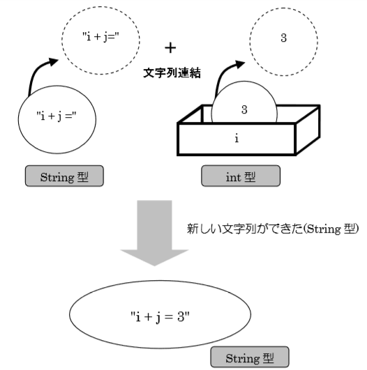 まず①の演算部分を説明します。以下の図 5.5.4 は上の①演算部分である「”i + j =” + i」を表しています。左辺に String 型があるので、+演算子は加算ではなく文字列連結として作用します。その結果は新しい String 型として「”i+j=3”」となります。