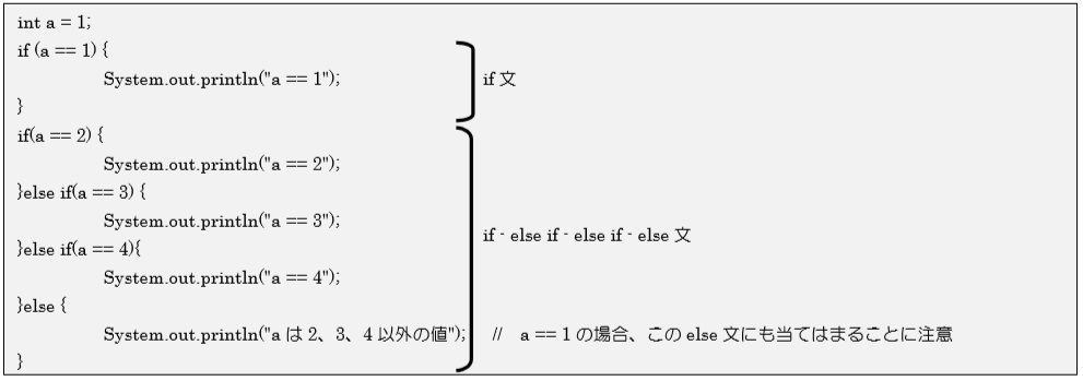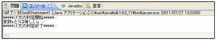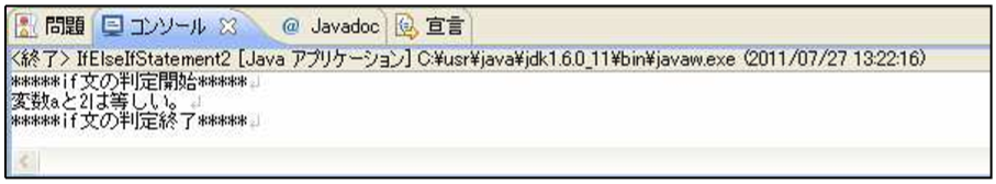 [html] package jp.co.f1.intro.ch6; public class IfElseIfStatement2 { public static void main(String[] args) {  //比較用の値を管理するための変数      int a = 2;      System.out.println(“*****if 文の判定開始*****”);      if(a==1){         System.out.println(“変数 a と 1 は等しい。”);      }else if(a == 2){         System.out.println(“変数 a と 2 は等しい。”);      }else{         System.out.println(“変数 a は 1 とも 2 とも等しくない。”);      }      System.out.println(“*****if 文の判定終了*****”); } } [/html]