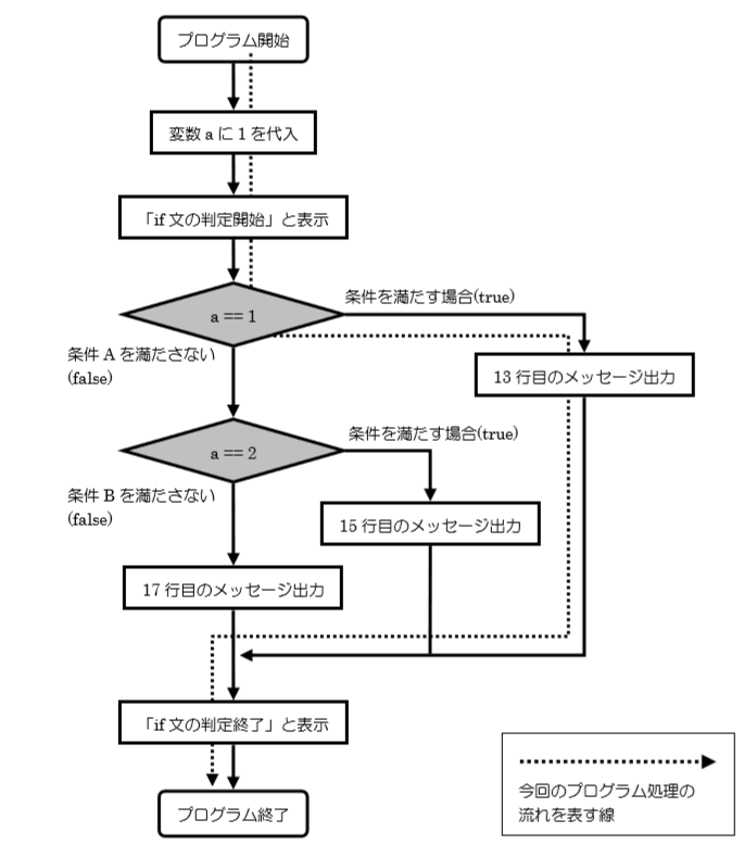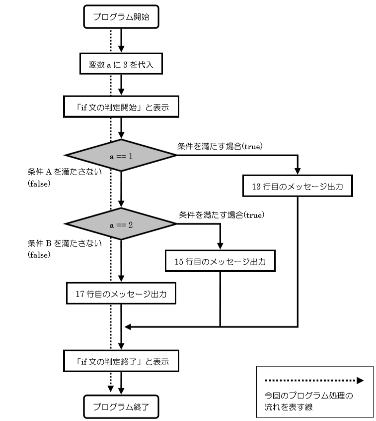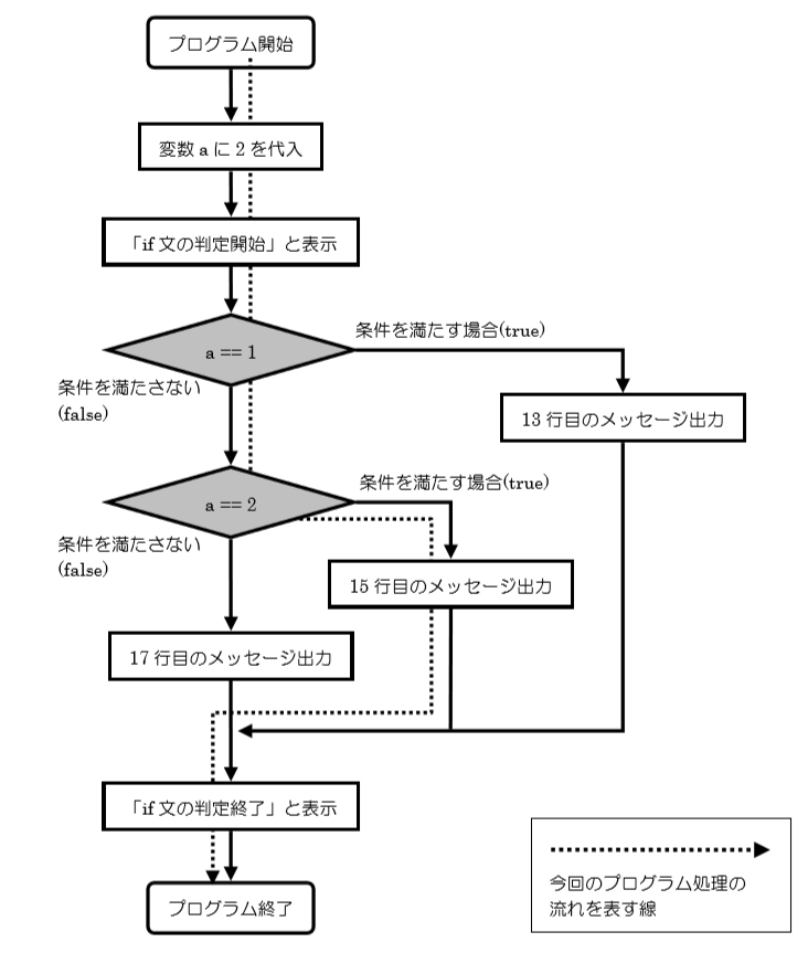 14 行目では else if 文の条件式「a == 2」を判定します。これは「2 == 2」になり、条件は満たされます。そのため、else if ブロック内の 15 行目が実行されます。