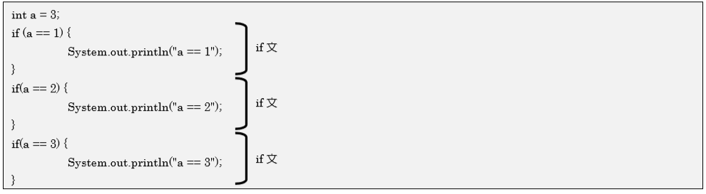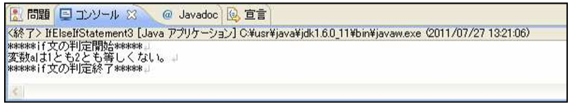 [html] package jp.co.f1.intro.ch6; public class IfElseIfStatement3 { public static void main(String[] args) {  //比較用の値を管理するための変数      int a = 3;      System.out.println(“*****if 文の判定開始*****”);      if(a == 1){         System.out.println(“変数 a と 1 は等しい。”);      }else if(a == 2){         System.out.println(“変数 a と 2 は等しい。”);      }else{         System.out.println(“変数 a は 1 とも 2 とも等しくない。”);      }      System.out.println(“*****if 文の判定終了*****”); } } [/html]
