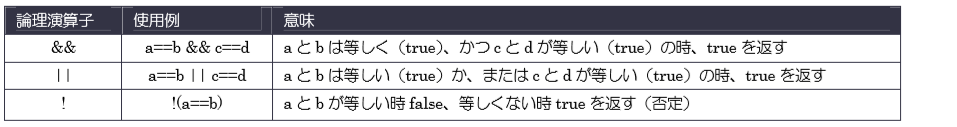 複雑な条件を組み合わせて表すときに使うのが論理演算子です。論理演算子の左右に来るのは、必ず true かfalse、もしくは解がそのようになる式となります。論理演算子は if 文、for 文、while 文の条件式で、比較演算子とともによく使用されます。