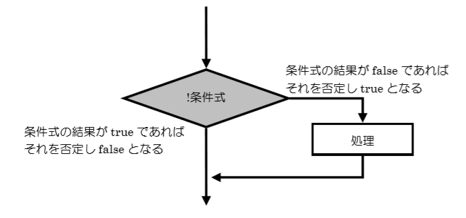 論理演算子「!」は条件の否定を表すものですので、この場合は、もし条件式の結果が true ならそれを否定されるので処理は行われない、もし条件式の結果が false ならそれを否定されるので処理が行われるということになります。