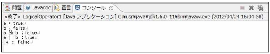 [html] package jp.co.f1.intro.ch6; public class LogicalOperator1 { public static void main(String[] args) { //比較用の真偽値を管理するための変数 boolean a = true; boolean b = false; System.out.println(“a = ” + a); System.out.println(“b = ” + b); System.out.println(“a && b :” + (a && b)); System.out.println(“a || b :” + (a || b)); System.out.println(“!a : ” + (!a)); } } [/html]実行結果