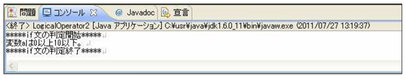 [html] package jp.co.f1.intro.ch6; public class LogicalOperator2 { public static void main(String[] args) { //比較用の数値を管理するための変数 int a = 5; System.out.println(“*****if 文の判定開始*****”); if(0 <= a && a <= 10){ System.out.println(“変数 a は 0 以上 10 以下。”); }else{ System.out.println(“変数 a は 0 以上 10 以下ではない。”); } System.out.println(“*****if 文の判定終了*****”); } } [/html]実行結果