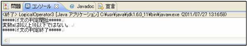 [html] package jp.co.f1.intro.ch6; public class LogicalOperator3 { public static void main(String[] args) { //比較用の数値を管理するための変数 int a = 11; System.out.println(“*****if 文の判定開始*****”); if(0 <= a && a <= 10){ System.out.println(“変数 a は 0 以上 10 以下。”); }else{ System.out.println(“変数 a は 0 以上 10 以下ではない。”); } System.out.println(“*****if 文の判定終了*****”); } } [/html]実行結果