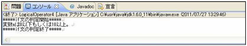 [html] package jp.co.f1.intro.ch6; public class LogicalOperator4 { public static void main(String[] args) { //比較用の数値を管理するための変数 int a = 15; System.out.println(“*****if 文の判定開始*****”); if(a <= 0 || 10 <= a){ System.out.println(“変数 a は 0 以下 もしくは 10 以上。”); }else{ System.out.println(“変数 a は 0 以下 もしくは 10 以上ではない。”); } System.out.println(“*****if 文の判定終了*****”); } } [/html]実行結果