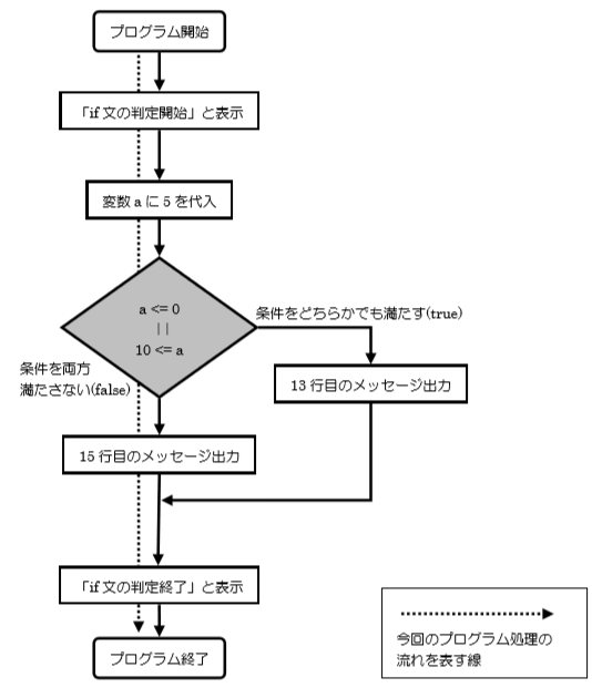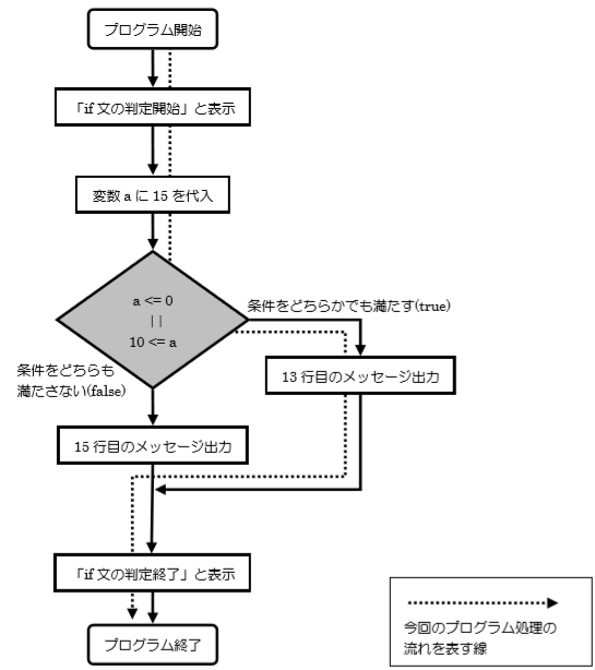 12 行目の if 文では、「変数 a が 0 以下もしくは 10 以上」の場合、13 行目の処理で「変数 a は 0 以下もしくは10 以上。」というメッセージを出力します。12 行目の条件が成立しない場合 14 行目の else 文にあてはまり、15行目で「変数 a は 0 以上 10 以下。」というメッセージを出力します。