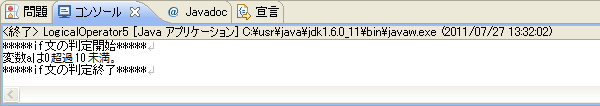 [html] package jp.co.f1.intro.ch6; public class LogicalOperator5 { public static void main(String[] args) { //比較用の数値を管理するための変数 int a = 5; System.out.println(“*****if 文の判定開始*****”); if(a <= 0 || 10 <= a){ System.out.println(“変数 a は 0 以下もしくは 10 以上。”); }else{ System.out.println(“変数 a は 0 超過 10 未満。”); } System.out.println(“*****if 文の判定終了*****”); } } [/html]実行結果
