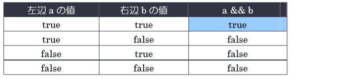 &&演算子は、左辺と右辺の値がともに「true」場合に、全体の値が true となり、それ以外の場合は false となります。