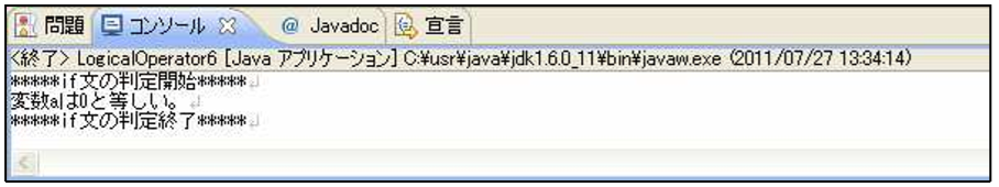 [html] package jp.co.f1.intro.ch6; public class LogicalOperator6 { public static void main(String[] args) { //比較用の数値を管理するための変数 int a = 0; System.out.println(“*****if 文の判定開始*****”); if(!(a == 0)){ System.out.println(“変数 a は 0 と等しくない。”); }else{ System.out.println(“変数 a は 0 と等しい。”); } System.out.println(“*****if 文の判定終了*****”); } } [/html]実行結果