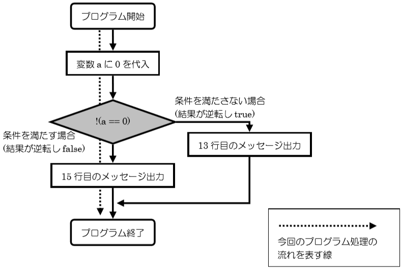 12 行目の if 文の条件式「!(a == 0)」では論理演算子!が記述されています。「a == 0」は true となりますが、論理演算子!が付くことにより true が否定され、この条件式の結果は false になります。よって、if 文は処理を行わず、else 文の中に入り 15 行目が実行されます。