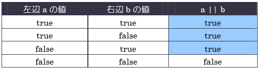 ||演算子を使った式は、左辺・右辺のどちらかの値が true であれば、全体の値が true となり、それ以外の場合は false となります。