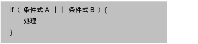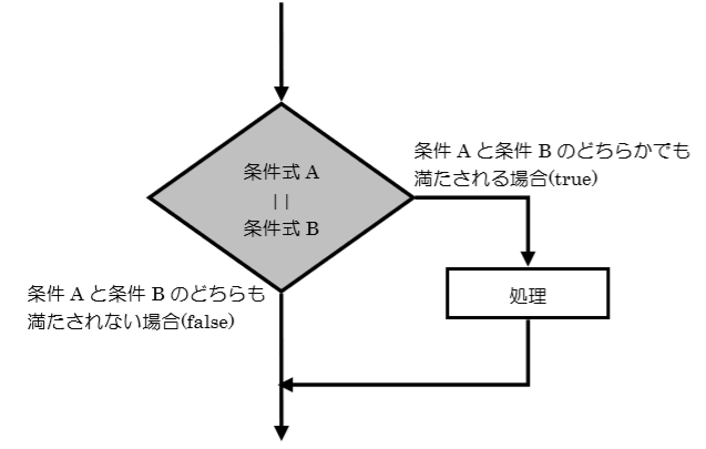 この場合は、もし条件式 A または条件式 B のどちらか合っていたら処理を行う、ということになります。