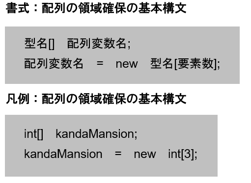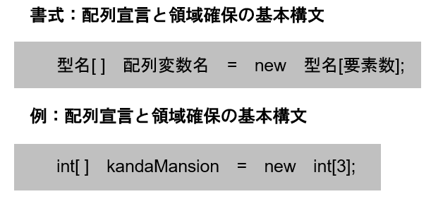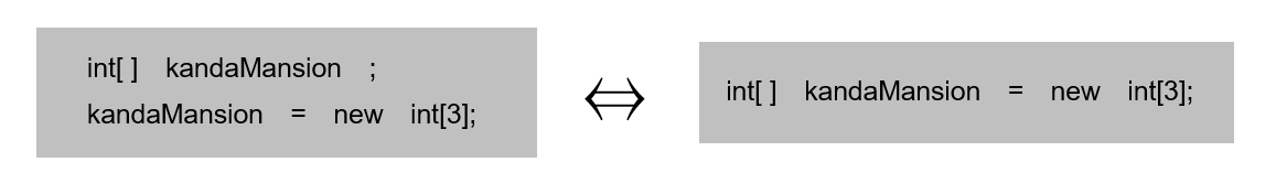 また、一度記憶領域を確保すると、後から配列の長さ(要素数、つまりここでは部屋数)を変更することはできませんので、注意が必要です。配列の長さを変えたい場合は、その長さで新しく要素の記憶領域を確保することが必要です。例えば、「kandaMansion = new int[3]」と記述し要素の長さが3の記憶領域が確保されているものから、要素の長さを5に変更するとします。その場合は、「kandaMansion = new int[5]」と再度new演算子を使って要素の記憶領域を確保しなければなりません。