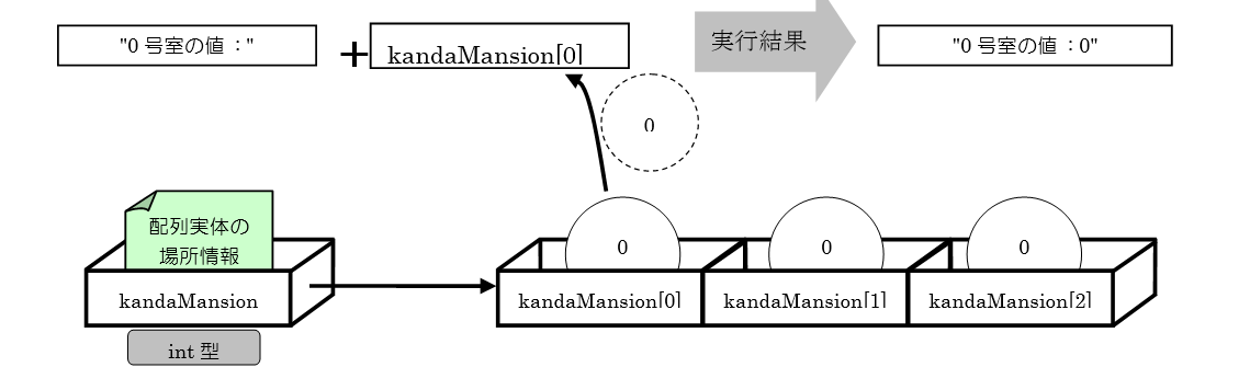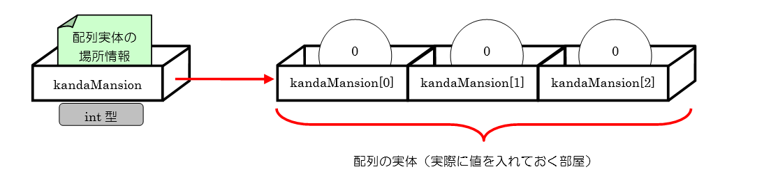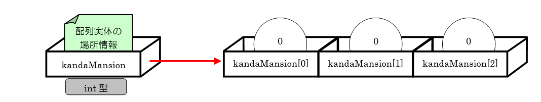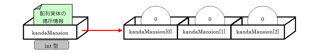 これで、配列変数kandaMansionが、実際に値が入っている場所を参照するようになります。当テキストでは、「参照する」という意味を矢印(→)で表します。配列変数kandaMansionに代入されている値は、配列の実体である要素(ここではkandaMansion[0])がメモリ上に記憶されている場所情報です。