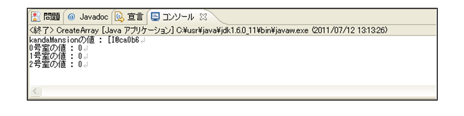 [html] package jp.co.f1.intro.ch9; public class CreateArray { public static void main(String[] args) { // 配列変数の宣言と要素の作成 int[] kandaMansion; kandaMansion = new int[3]; System.out.println(“kandaMansionの値 : ” + kandaMansion); System.out.println(“0号室の値 : ” + kandaMansion[0]); System.out.println(“1号室の値 : ” + kandaMansion[1]); System.out.println(“2号室の値 : ” + kandaMansion[2]); } } [/html]実行結果