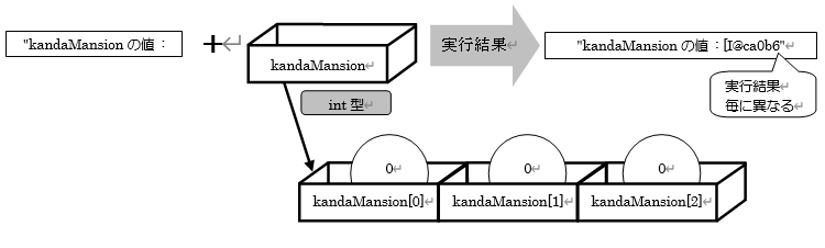 配列変数kandaMansionには、配列の実体の「場所情報」が入っていますが、今回表示された文字列は、その場所情報が暗号化されたものです。なお、ここでは「[I@ca0b6」という表示値になりましたが、これは実行結果毎に異なる場合があります。