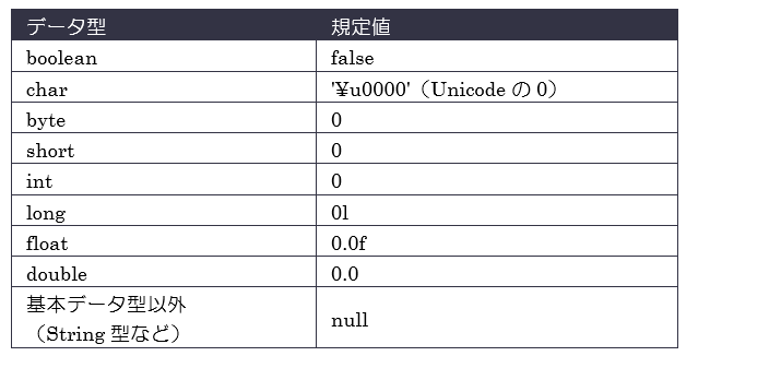 int型の配列の要素の規定値は0ですが、型によって規定値は異なります。以下がその一覧です。