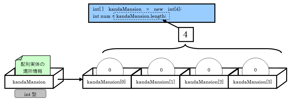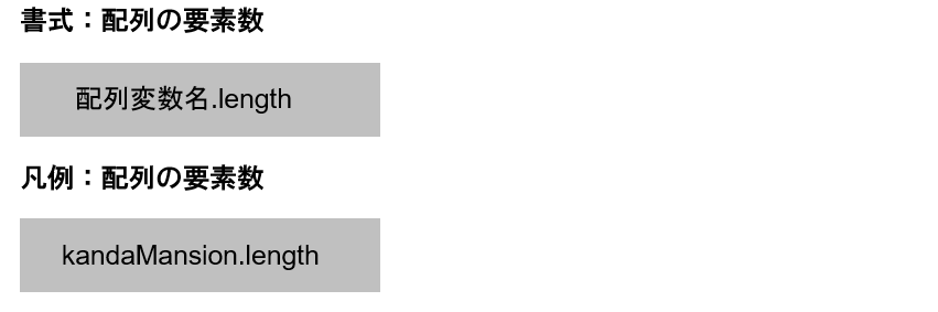 配列の要素数(これまで例にしていたマンションの「部屋数」)を知りたい場合は、配列のlengthという属性を使って取得することができます。