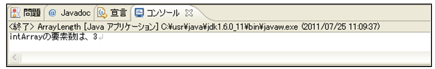 [html] package jp.co.f1.intro.ch9; public class ArrayLength { public static void main(String[] args) { // 配列変数の宣言と要素の作成 int[] intArray = new int[3]; System.out.println(“intArrayの要素数は、” + intArray.length); } } [/html]