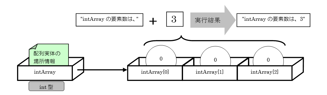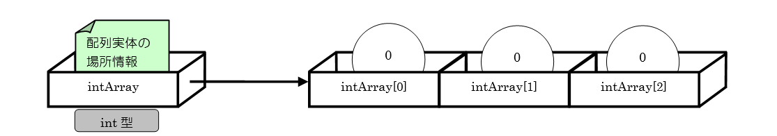 8行目では、3つの要素を持つint型の配列intArrayの宣言と記憶領域の確保を行っています。