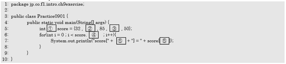 問4 次の実行結果になるソースコードPractice0901.javaの空欄①~⑤について答えなさい。