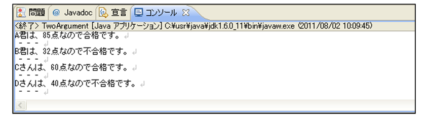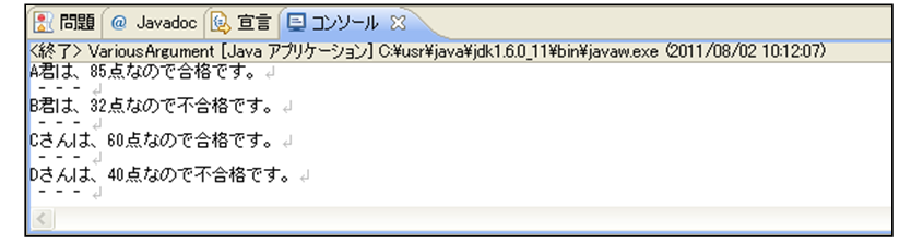 [html] package jp.co.f1.intro.ch10; public class VariousArgument { static void checkPass(String name, int point, int passPoint) { System.out.print(name + "は、"); if (point >= passPoint) { System.out.println(point + "点なので合格です。"); } else { System.out.println(point + "点なので不合格です。"); } System.out.println(" – – – "); } public static void main(String[] args) { // 点数を管理する変数の宣言と初期化 int pointA = 85; int pointB = 32; int pointC = 60; int pointD = 40; checkPass("A君", pointA, 50); checkPass("B君", pointB, 50); checkPass("Cさん", pointC, 50); checkPass("Dさん", pointD, 50); } } [/html]実行結果
