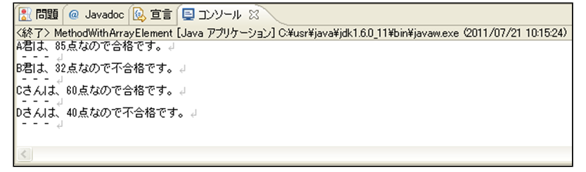 [html] package jp.co.f1.intro.ch10; public class MethodWithArrayElement { static void checkPass(int point){ if(point >= 50){ System.out.println(point + "点なので合格です。"); }else{ System.out.println(point + "点なので不合格です。"); } System.out.println(" – – – "); } public static void main(String[] args) { // String型の名前を管理する配列の宣言と初期化 String[] aryName = {"A君", "B君", "Cさん", "Dさん"}; // int型の点数を管理する配列の宣言と初期化 int[] point = {85, 32, 60, 40}; for(int i = 0; i < aryName.length; i++){ System.out.print(aryName[i] + "は、"); checkPass(point[i]); } } } [/html]実行結果