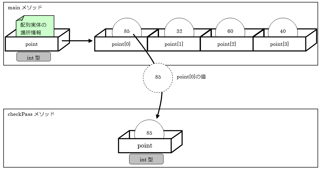 次に、26行目のcheckPassメソッドを実行します。このメソッドには配列変数pointのインデックス0の値である85を引数に渡しています。このイメージは、図 10.3.1になります。
