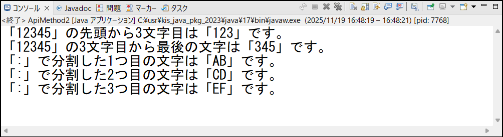 [html] package jp.co.f1.intro.ch10; public class ApiMethod2 { public static void main(String[] args) { String str1 = "12345"; String str2 = "AB:CD:EF"; System.out.println("「" + str1 + "」の先頭から3文字目は「" + str1.substring(0, 3) + "」です。"); System.out.println("「" + str1 + "」の3文字目から最後の文字は「" + str1.substring(2) + "」です。"); String[] strArray = str2.split(":"); for (int i = 0; i < strArray.length; i++) { System.out.println("「:」で分割した" + (i + 1) + "つ目の文字は「" + strArray[i] + "」です。"); } } } [/html]実行結果