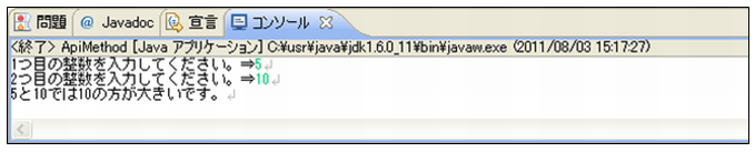 [html] package jp.co.f1.intro.ch10; import java.util.Scanner; public class ApiMethod1 { public static void main(String[] args) { Scanner sin = new Scanner(System.in); System.out.print("1つ目の整数を入力してください。⇒"); String strNum1 = sin.nextLine(); int intNum1 = Integer.parseInt(strNum1); System.out.print("2つ目の整数を入力してください。⇒"); int intNum2 = sin.nextInt(); if (intNum1 != intNum2) { int maxNum = Math.max(intNum1, intNum2); System.out.println(intNum1 + "と" + intNum2 + "では" + maxNum + "の方が大きいです。"); } else { System.out.println(intNum1 + "と" + intNum2 + "は等しいです。"); } } } [/html]実行結果