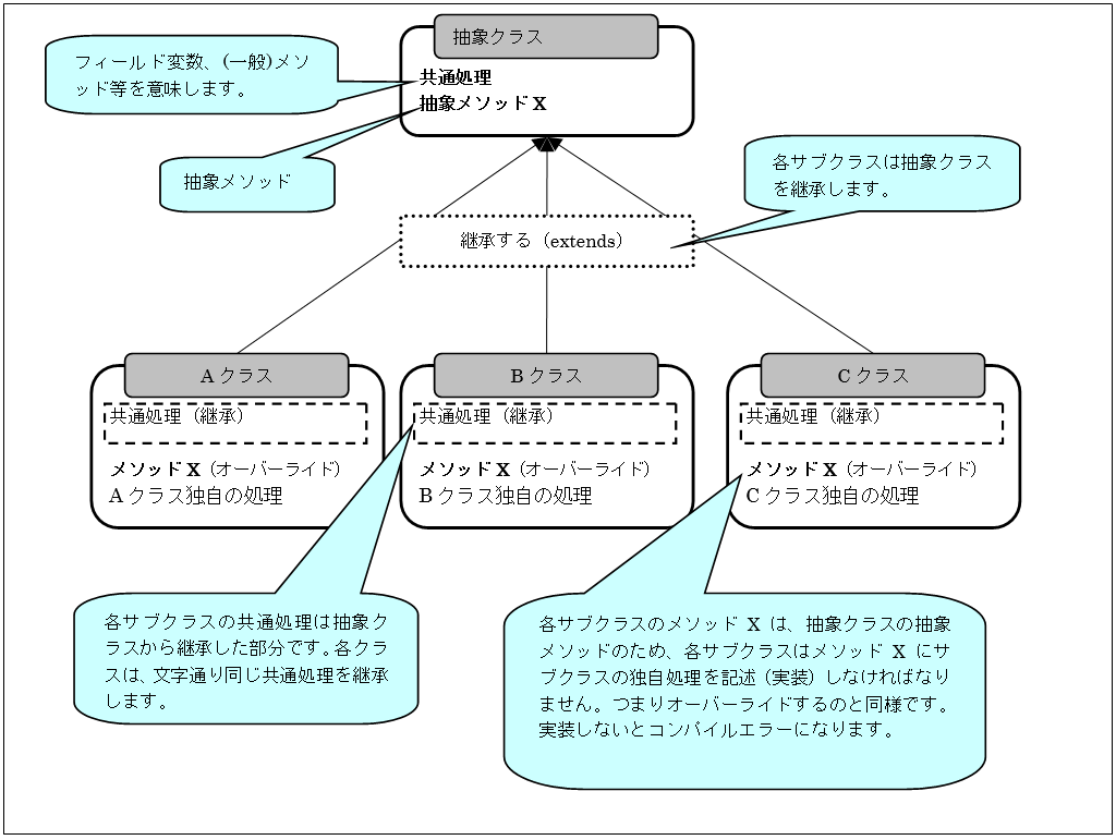 ・ 抽象メソッドがある抽象クラスを継承したサブクラスは、抽象メソッドを必ずオーバーライドしなければなりません。(オーバーライドしないとコンパイラエラーになります。)