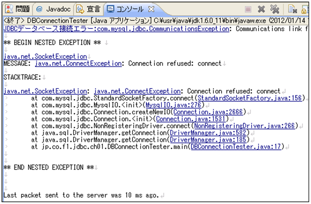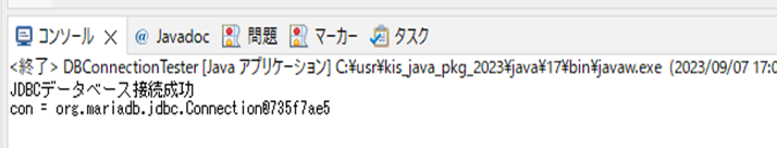 [html] package jp.co.f1.jdbc.ch01; import java.sql.*; public class DBConnectionTester { //接続用の情報をフィールドに定数として定義 public static String RDB_DRIVE = "org.mariadb.jdbc.Driver"; public static String URL = "jdbc:mariadb://localhost/mybookdb"; public static String USER = "bms"; public static String PASSWD = "bms123"; public static void main(String[] args) { try{ Class.forName(RDB_DRIVE); Connection con = DriverManager.getConnection(URL, USER, PASSWD); //接続成功メッセージとコネクション情報の表示 System.out.println("JDBCデータベース接続成功"); System.out.println("con = " + con); con.close(); }catch(Exception e){ System.out.println("JDBCデータベース接続エラー:" + e); } } } [/html]