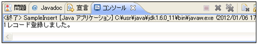今回のプログラムでは「登録された件数が1件」という情報のみ表示されるため、データが正しく登録されたかどうか確認することができません。データを確認したい場合は、2.2節で作成したプログラム「SampleSelect.java」を実行しデータを確認してみてください。