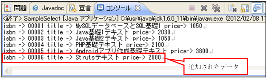再度、登録できるようにするためには、コマンドプロンプトからisbnが「00006」のデータを削除するか、プログラム内のSQL文のisbnを、登録されていない番号に変更しプログラムを実行してください。