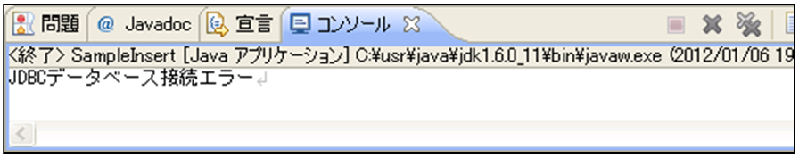 2回目以降のプログラムの実行「SampleInsert.java」では登録するisbnの情報が固定値でプログラム上に記述しています。isbnは重複したデータが登録できない仕様のため、1度目の実行では実行結果画面と同じ表示が行われますが、2度目以降はエラーメッセージが表示されることになります。