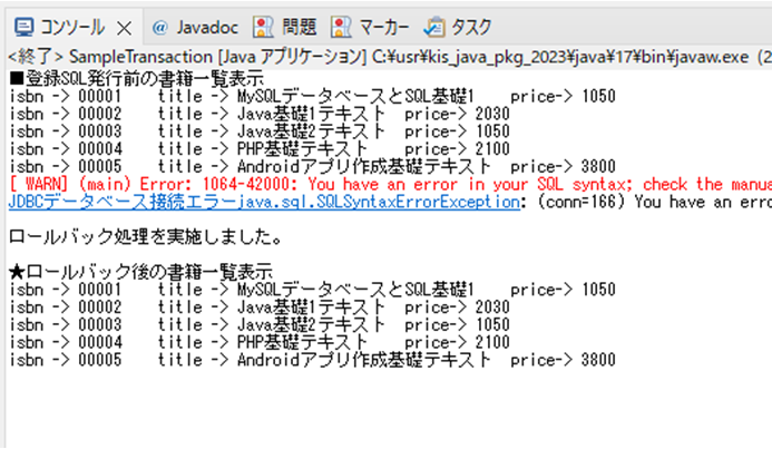 本テキストではデータのロールバックは実行していません。もしもロールバック処理の確認を行いたい場合には、SampleTransaction.javaプログラムの36行目にあるINSERT文を、実行できないSQL文に変更しエラーを発生させることで確認することができます。