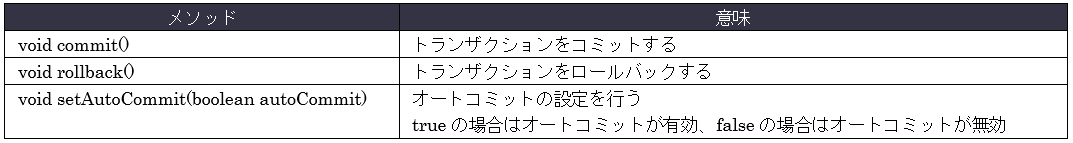JDBC(java.sqlパッケージ)内のConnectionクラスには、オートコミットの設定を変更するメソッドや、処理を確定するメソッドなど、トランザクションに関連するメソッドが定義されています。