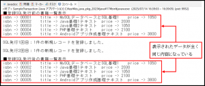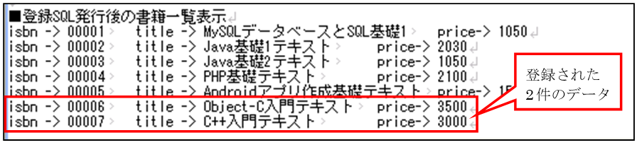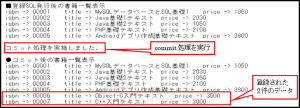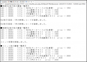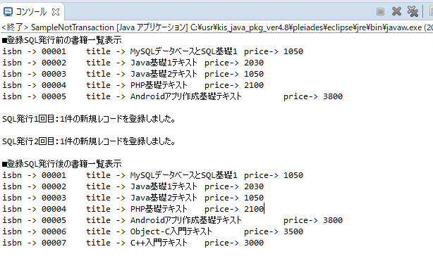 このプログラムでは、今まで作成したプログラムと同様にトランザクション処理を行なっていないため、SQL文が実行されると即データベースに処理の結果が反映します。実行結果を確認すると2回目のSQL文を実行した直後の表示結果にデータが反映しているのが確認できます。