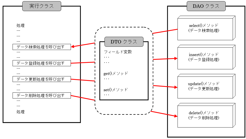 DAOクラスとDTOクラスをセットで利用する場合、DTOクラスはデータベースの1レコードを管理できるクラスとして定義し、DAOクラスの更新系メソッドの引数や検索系メソッドの戻り値に利用します。