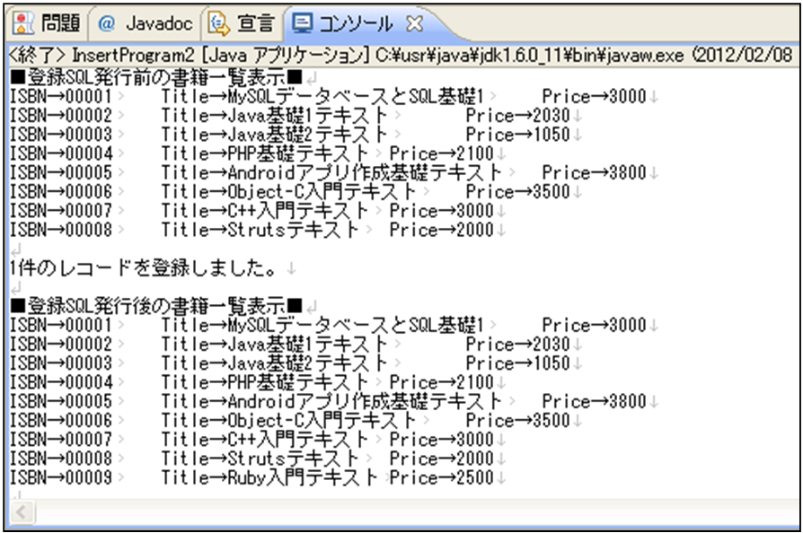 [html] package jp.co.f1.jdbc.ch04; import java.util.ArrayList; public class InsertProgram2 { // 配列宣言 private static ArrayList<SampleDTO>bookList = null; // SampleDTO型のオブジェクトを格納するArrayList public static void main(String[] args) { try{ // DAOオブジェクト化 SampleDAO2 objDao = new SampleDAO2(); // 書籍情報を取得するメソッドをDAOから呼び出す bookList = objDao.selectAll(); // 全ての情報を取得メソッド呼び出し // 取得した書籍情報を表示 System.out.println(“■登録SQL発行前の書籍一覧表示■”); display(); SampleDTO bookDto = new SampleDTO(); bookDto.setIsbn(“00009”); bookDto.setTitle(“Ruby入門テキスト”); bookDto.setPrice(2500); // 書籍情報を登録するメソッドをDAOから呼び出す int rowsCount = objDao.insertBook(bookDto); if(rowsCount > 0){ System.out.println(rowsCount + “件のレコードを登録しました。\n”); } // 書籍情報を取得するメソッドをDAOから呼び出す bookList = objDao.selectAll(); // 全ての情報を取得メソッド呼び出し // 取得した書籍情報を表示 System.out.println(“■登録SQL発行後の書籍一覧表示■”); display(); }catch(Exception e){ System.out.println(“エラーが発生しました。” + e); } } public static void display() { for(int i=0;i<bookList.size();i++){ SampleDTO bookDto = bookList.get(i); System.out.print(“ISBN→” + bookDto.getIsbn() + “\t”); System.out.print(“Title→” + bookDto.getTitle() + “\t”); System.out.print(“Price→” + bookDto.getPrice() + “\n”); } System.out.println(); } } [/html]