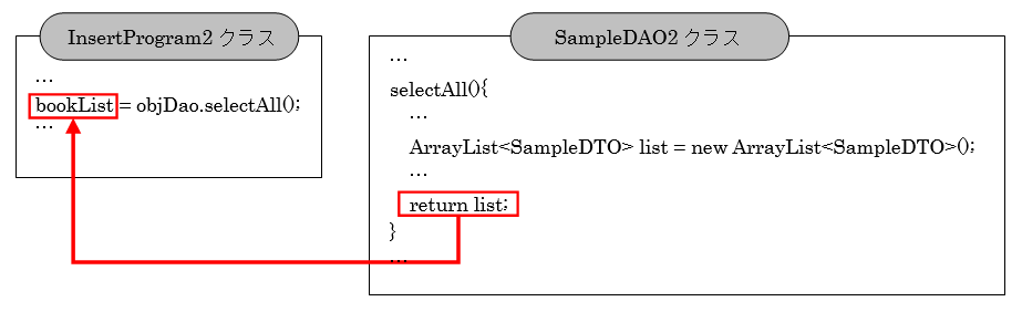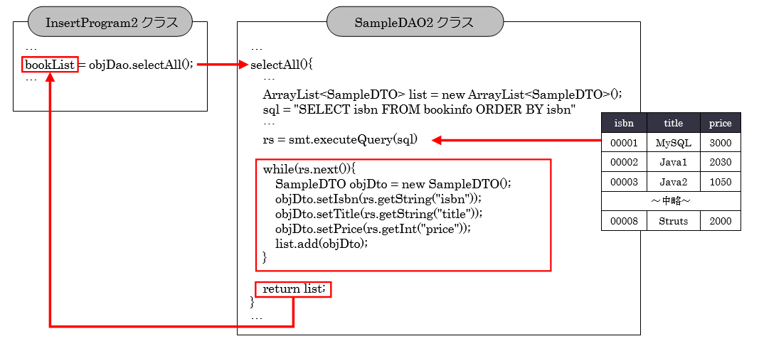 16行目ではSampleDAO2クラスのselectAll()メソッドを呼び出し、テーブルに登録された全ての情報を検索しています。その戻り値としてArrayList<SampleDTO>オブジェクトを受け取っています。