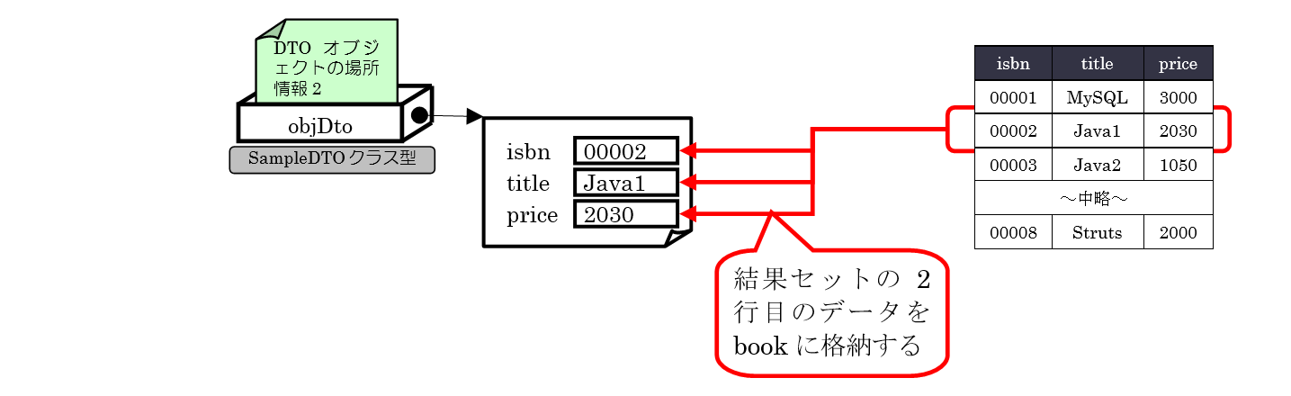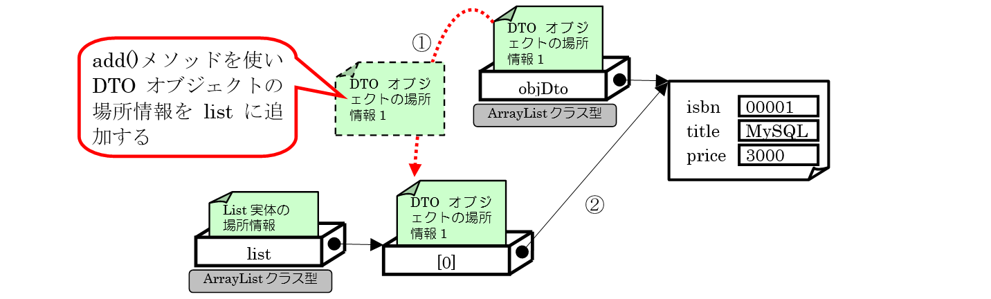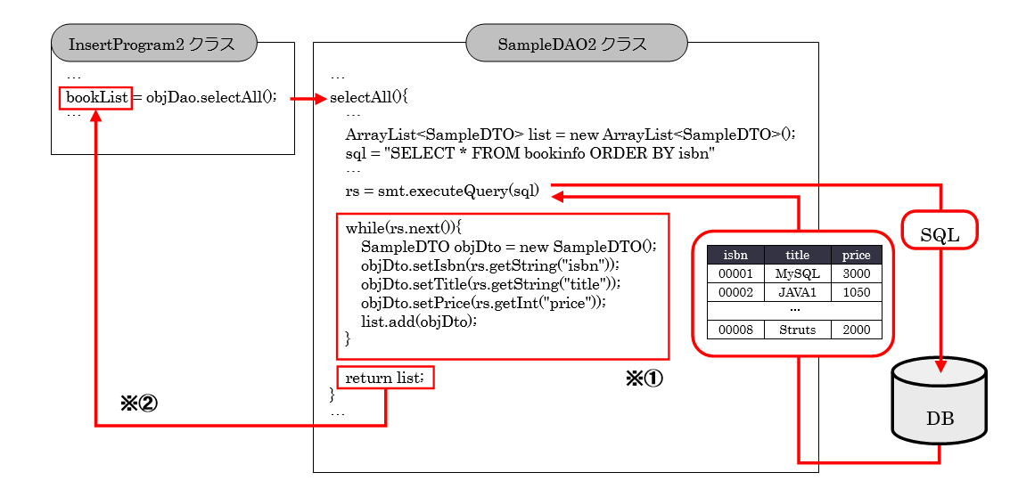 図の※①の部分の処理ではSELECT文の結果セットから1行分のデータを取得し、DTOクラスのオブジェクトへ格納、その後、ArrayListにDTOクラスのオブジェクトを追加します。