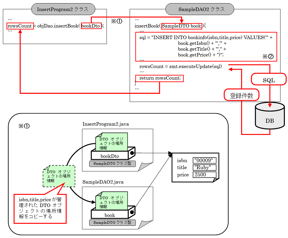 28行目のデータの登録処理でもDTOクラスが利用されています。SampleDAO2クラスのinsertBook()メソッドを呼び出し、引数にDTOクラスを渡しています。
