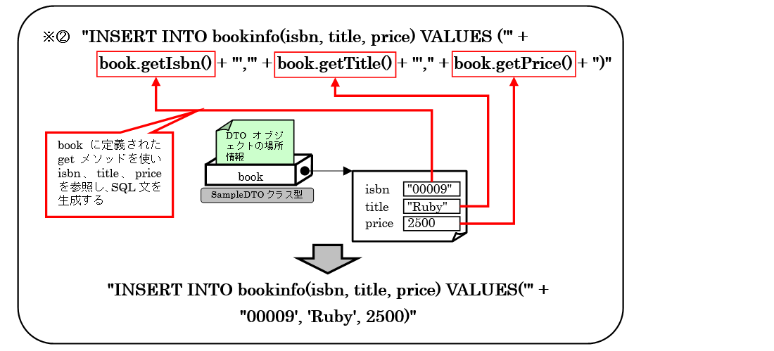 引数で渡されたDTOにはisbnとtitle、price情報が格納されていて、insertBook()メソッドではDTO内のデータ使ってSQL文を生成します。その際、DTOクラスの中のデータはprivate修飾子がついているため、ゲッターメソッドを利用して参照することになります。