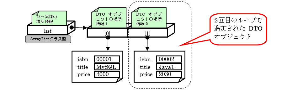 2回目のループが終了すると以下のように2つ目のDTOオブジェクトが追加された状態になります。