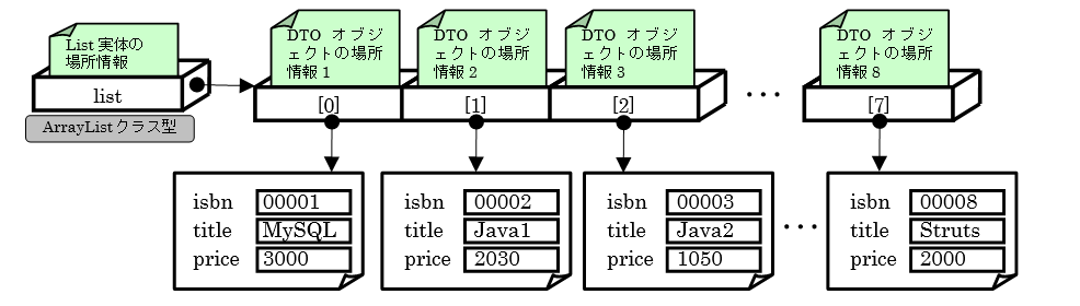 最後の行のデータが格納されたDTOオブジェクトを、add()メソッドを使いArrayListに格納すると、以下のように8つのデータが追加された状態になります。
