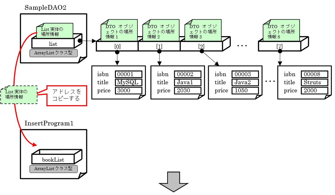 この場合、selectAllメソッドの呼び出し元にある戻り値を受け取る変数にはList実体の場所情報がコピーされ、データを参照することが可能になります。この処理の流れは以下の図のようになります。