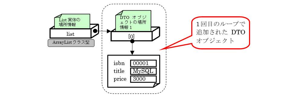 1回目のループが終了すると、以下のように1つにDTOオブジェクトが追加された状態になります。
